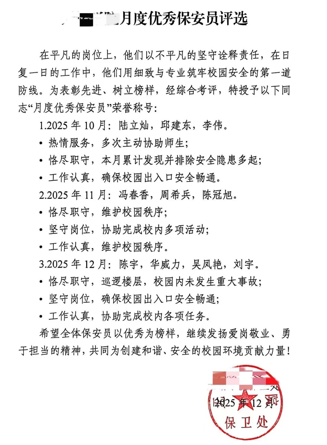 秩序标杆:严控出入口人车分流,确保校园交通“零拥堵”,获师生好评;