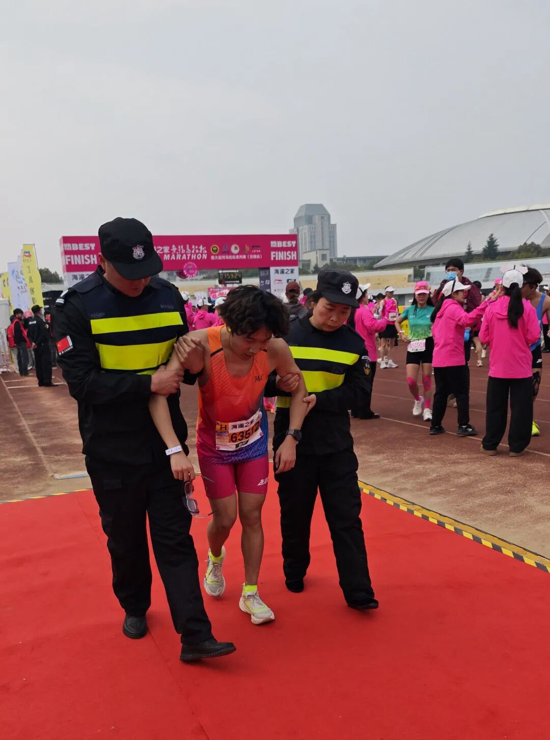 晨光点亮锡城,35000名跑者汇成粉色海洋。江南大学赛道旁、半马终点线后,英杰保安筑牢安全防线,默默护航这场热血奔跑,助力大赛圆满成功。